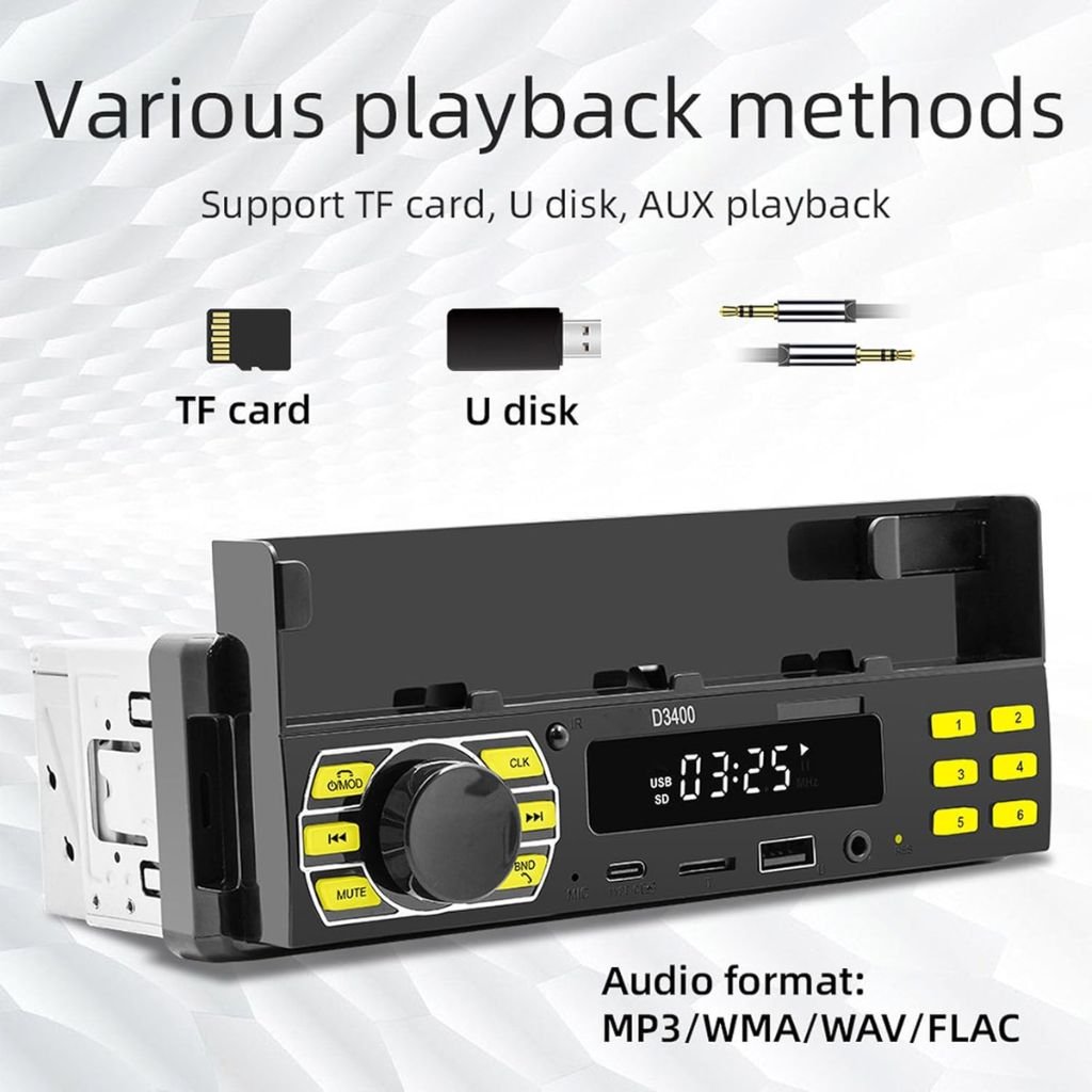 🎶 راديو سيارة متعدد الوظائف مع إضاءة LED📱 بلوتوث مدمج: للمكالمات والموسيقى بدون أسلاك.🌈 إضاءة LED بـ 7 ألوان: لتخصيص مظهر سيارتك.🎤 مكالمات آمنة: مايكروفون مدمج لصوت واضح أثناء القيادة.📻 راديو FM عالي الجودة: للاستماع لمحطاتك المفضلة.🔌 منافذ متعددة: USB للشحن، قارئ بطاقات TF/SD، ومدخل AUX.🎮 ريموت تحكم: للتحكم السهل عن بُعد.لماذا تختاره؟ ✔ صوت عالي الجودة ✔ تصميم عصري بإضاءة قابلة للتخصيص ✔ تركيب سهل يناسب أغلب السيارات Idéal pour les professionnels nécessitant des appels mains libres en toute sécurité.
