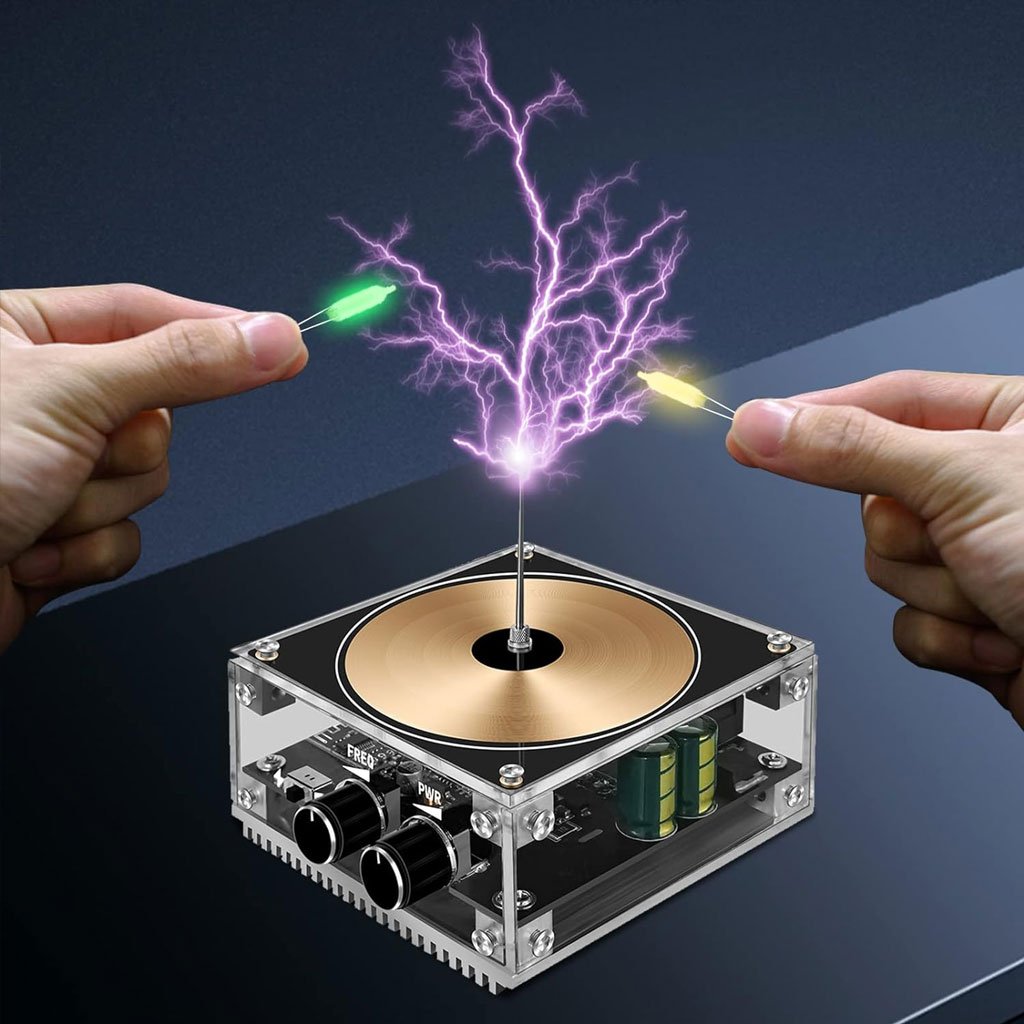 ملف تسلا بتقنية البلوتوث وتجربة البرق الصوتيتجربة علمية ممتعة: يولّد قوس برق مذهل بطول أكثر من 10 سم بتردد عالٍ، يمكن لمسه لتجربة إحساس فريد يشبه التدليك.تحكم موسيقي ذكي: اتصال بلوتوث لتزامن القوس مع الموسيقى.استخدامات متعددة: إشعال مصابيح النيون والأشعة فوق البنفسجية والورق الحراري (يشمل 10 أوراق حرارية + 6 مصابيح نيون + 1 مصباح UV).تعليمات أمان:لا تستخدمه بدون موسيقى لفترة طويلة.لا تضع أجسام ثقيلة على إبرة التفريغ.تجنب وضع LED مباشرة على السطح.أبعده عن المواد القابلة للاشتعال أو الانفجار.