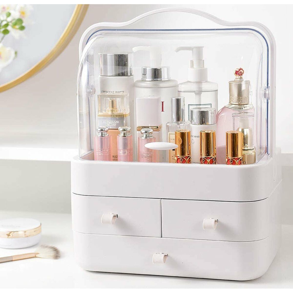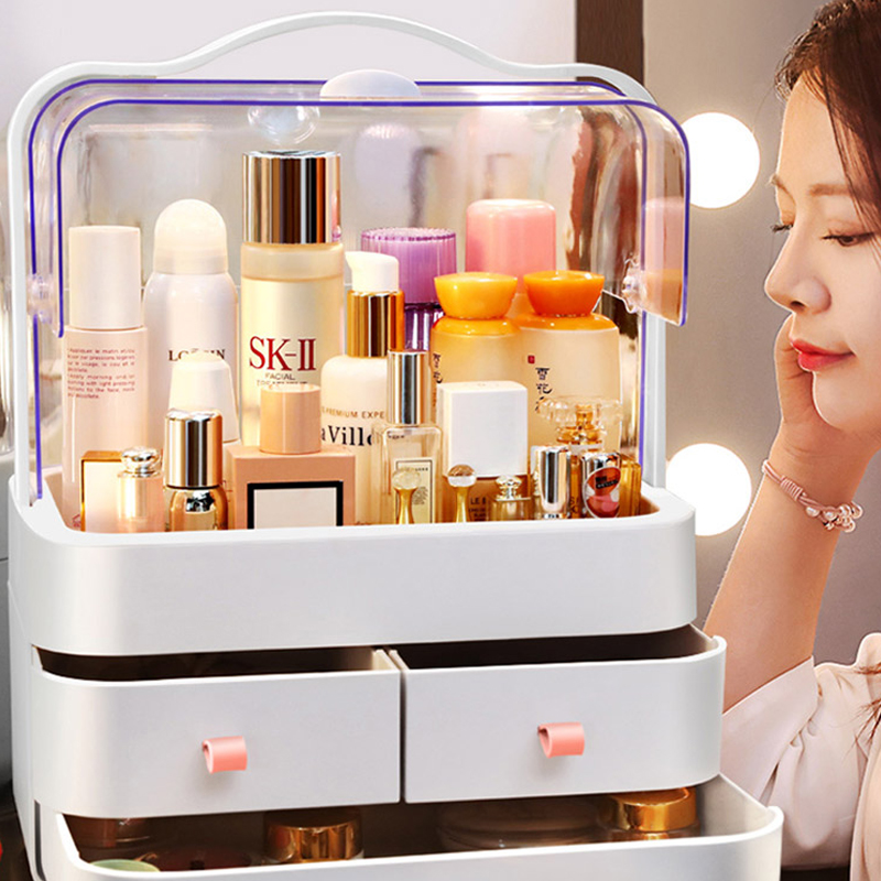 Organisateur pratique pour cosmétiques : les organisateurs de maquillage sont la solution parfaite si vous cherchez à simplifier votre routine de beauté et désencombrer votre maison en une seule étape facile.Grande capacité : le premier niveau de l’organisateur de maquillage avec rotation bilatérale vous permet de choisir vos produits de soins de la peau facilement. Les 2 tiroirs de rangement inférieurs permettent de ranger séparément les rouges à lèvres, gels à lèvres, pinceaux de maquillage, crayons à sourcils, bâtons de fond de teint, gadgets de beauté, colliers, bagues et plus encore.Résistant à la poussière et imperméable à l’eau – Le tiroir de rangement de maquillage avec couvercle est idéal pour ranger les articles de beauté personnels proprement et rend le comptoir de votre commode ou salle de bains bien rangé.Dimensions : 34,7 x 28,5 x 18,2 cm. L’organisateur de cosmétiques est fabriqué en matériau ABS de haute qualité et respectueux de l’environnement, durable et robuste. Facile à transporter, surtout lors de vos déplacements.Un cadeau parfait pour les femmes à la page : simplifiez votre routine de beauté avec la solution de rangement de cosmétiques. Idéal pour les anniversaires, Noël, le Nouvel An, la Saint-Valentin, la fête des Mères et plus encore.