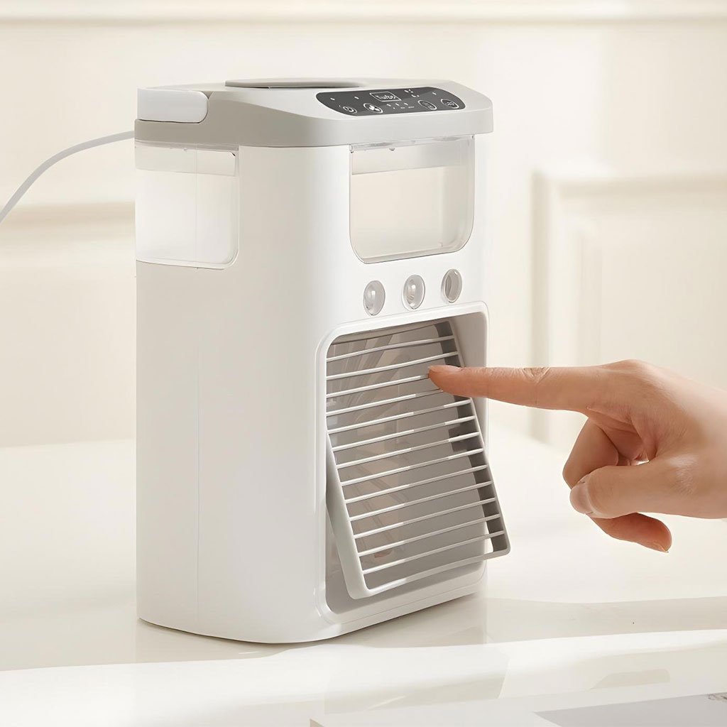 مبرد هواء 3 في 1 (مروحة + مرطب + إضاءة LED)السعة: 560 مل | الوزن: 600 جم | الطاقة: USBالاستخدام: مثالي للمنزل، المكتب، والسفر