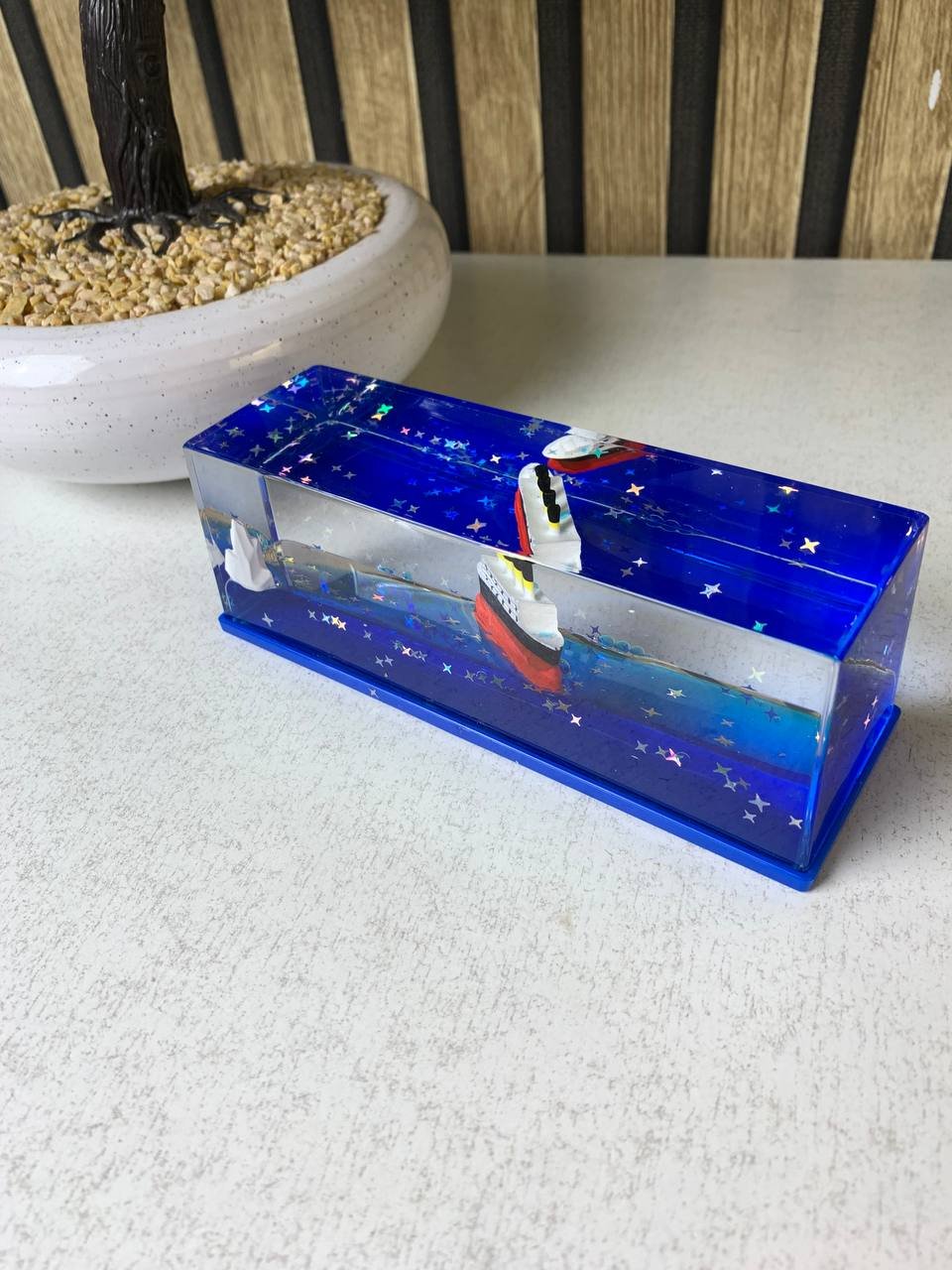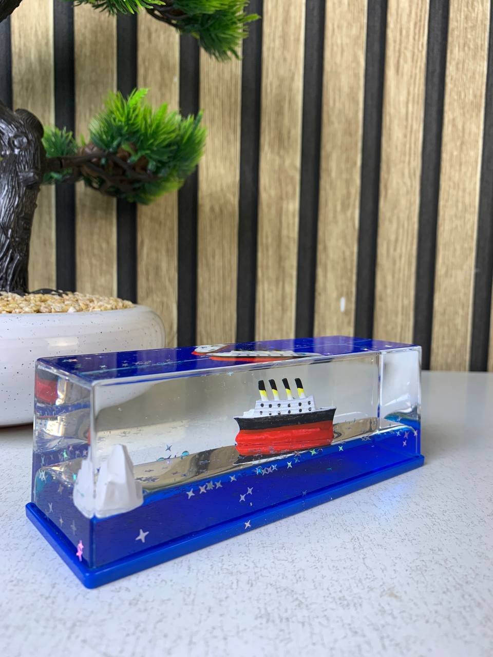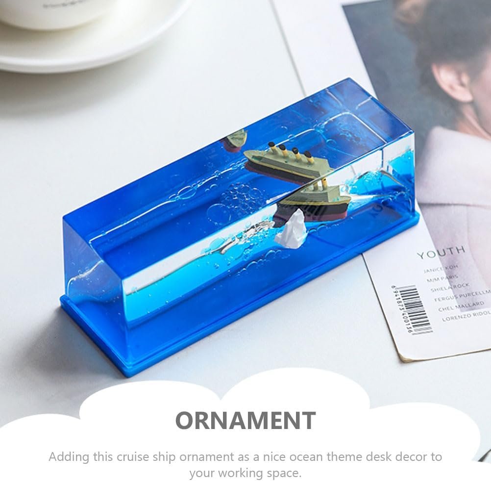 أضف لمسة من السحر والسكينة إلى مكتبك أو غرفتك مع هذه التحفة الفنية الفريدة! بفضل التصميم الفيزيائي المبتكر، تظل السفينة عائمة فوق الموج مهما بلغت درجة ميلانها أو اهتزازها، تماماً كأنها تبحر في محيط حقيقي لا يعرف الغرق. إنها ليست مجرد قطعة ديكور، بل هي وسيلتك الخاصة للهروب من ضجيج الحياة اليومية إلى عالم من الهدوء والجمال.أبرز المميزات التي تجعل هذه التحفة رفيقك المثالي:تأثير “مضاد للغرق” مذهل: بفضل السوائل المتدرجة الكثافة، تظل السفينة والـ “جبل الجليدي” عائمين دائماً فوق السطح، مما يعطي مشهداً بصرياً ممتعاً يحاكي تحدي الأمواج والصمود.علاج فعال للتوتر (Anti-Stress): مراقبة حركة السائل الأزرق الصافي وانسيابية السفينة تساعد على تصفية الذهن، تقليل القلق، وزيادة التركيز أثناء العمل أو الدراسة.خامات “أكريليك” فائقة النقاء: مصنوعة من مادة الأكريليك عالية الجودة التي تتميز بصفاء الكريستال ومتانة البلاستيك، مما يضمن لك رؤية واضحة تماماً وحماية ضد الكسر أو التسريب.جمالية سينمائية (Titanic Style): يجسد التصميم رمزية سفينة “تيتانيك” الشهيرة بلمسة رومانسية عصرية، مما يجعله قطعة فنية تلفت الأنظار وتضيف لمسة “مودرن” على أي رف أو مكتب.حركة انسيابية هادئة: صُممت السوائل بالداخل (الزيت المعدني والماء) لتتحرك ببطء يحاكي حركة أمواج المحيط الحقيقية، مما يوفر تجربة بصرية مريحة جداً للعين.الهدية الأكثر تميزاً: تعتبر هدية مثالية لعشاق البحر، أصحاب المكاتب، والأشخاص الذين يبحثون عن قطع ديكور غير تقليدية تجمع بين الرمزية والجمال.