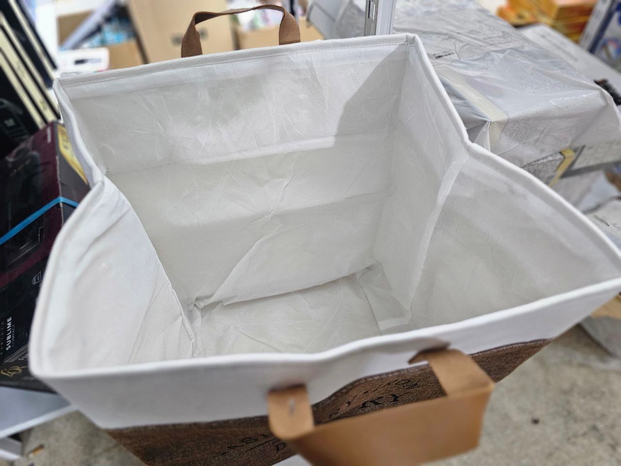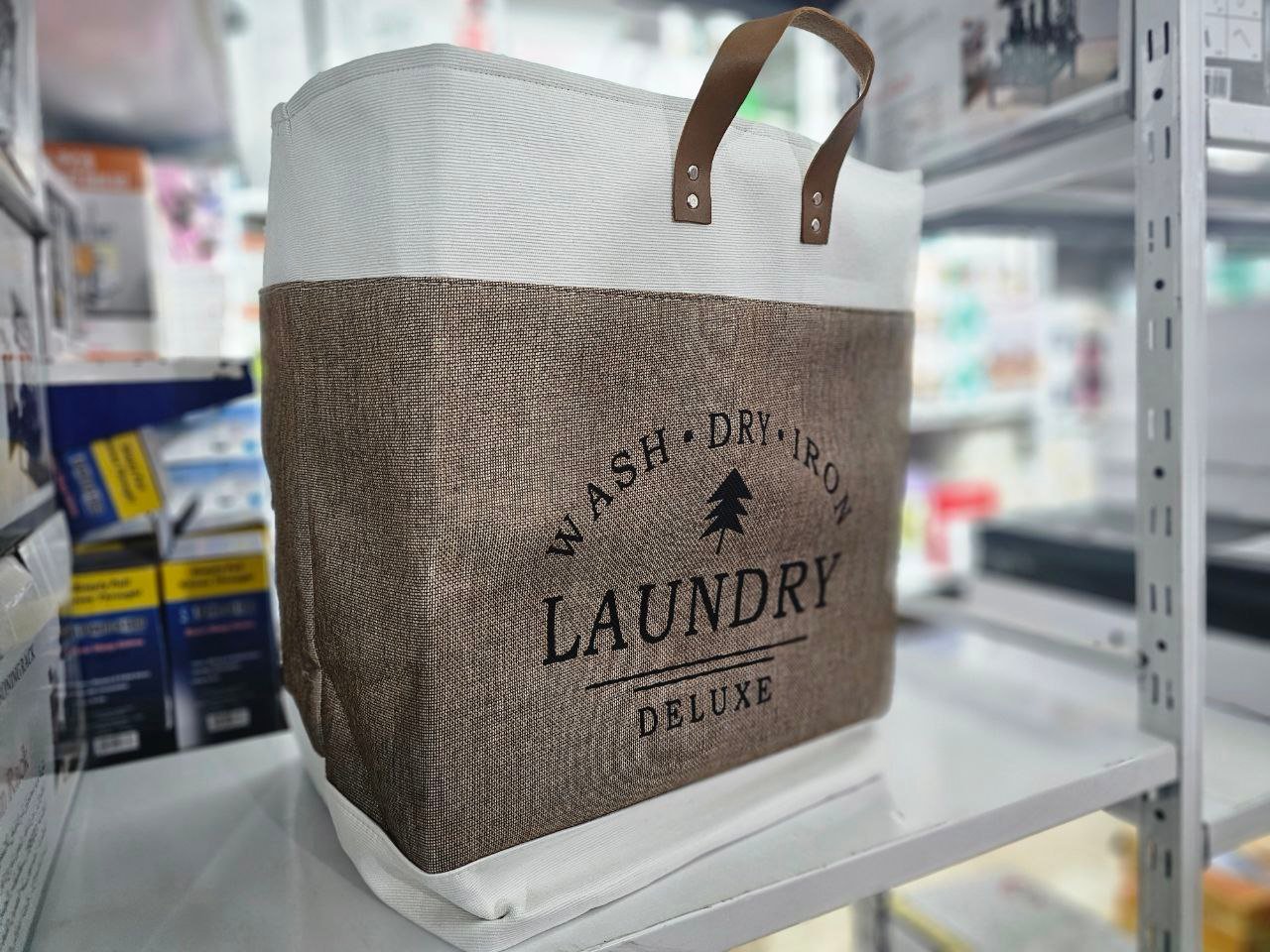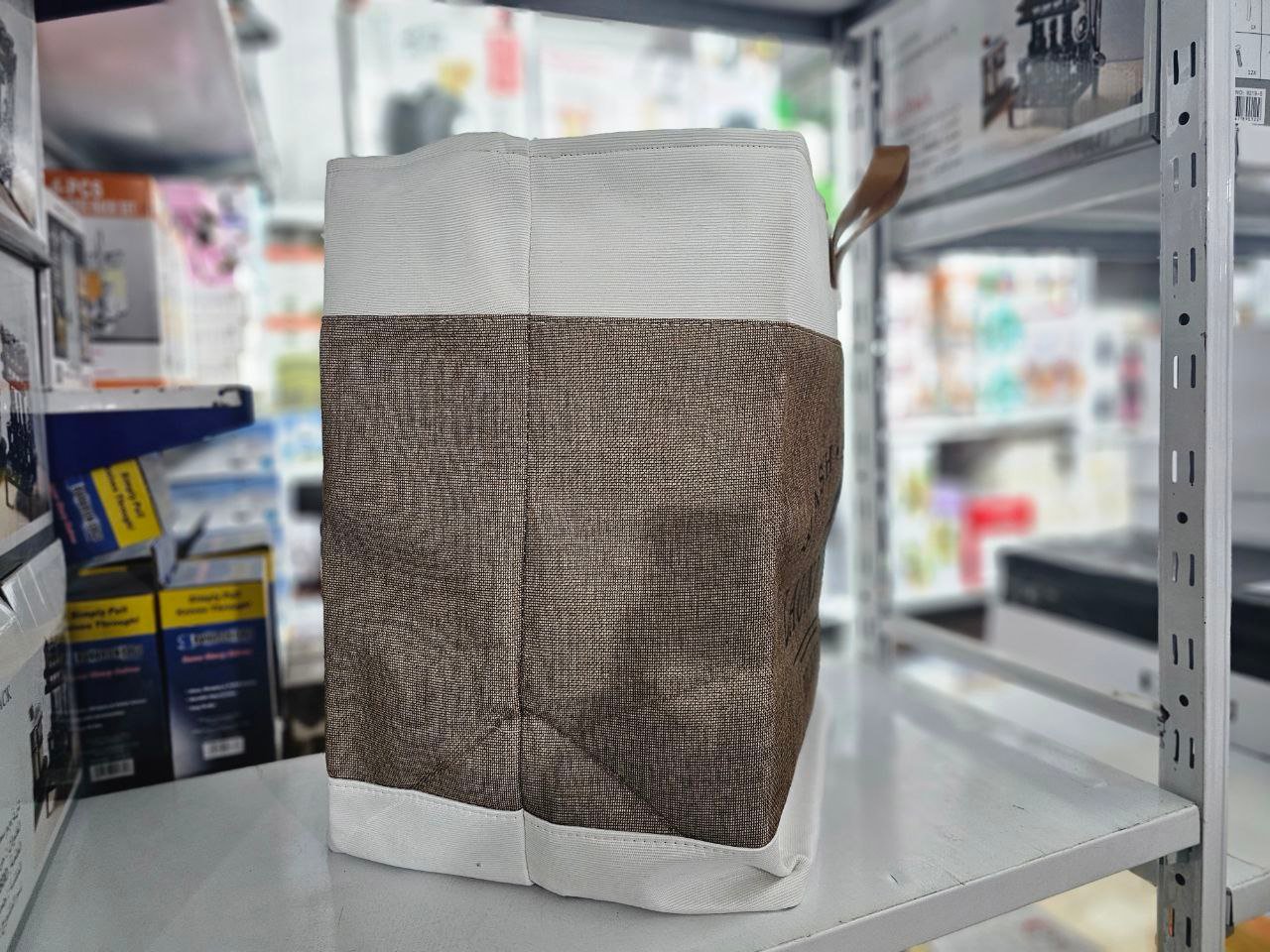 سلة تخزين منزليةالمقاس: 35 × 35 × 56 سم (ارتفاع).اللون: أبيض وبني.الخامة: قطن، كتان، جلد صناعي PU، EVA.
