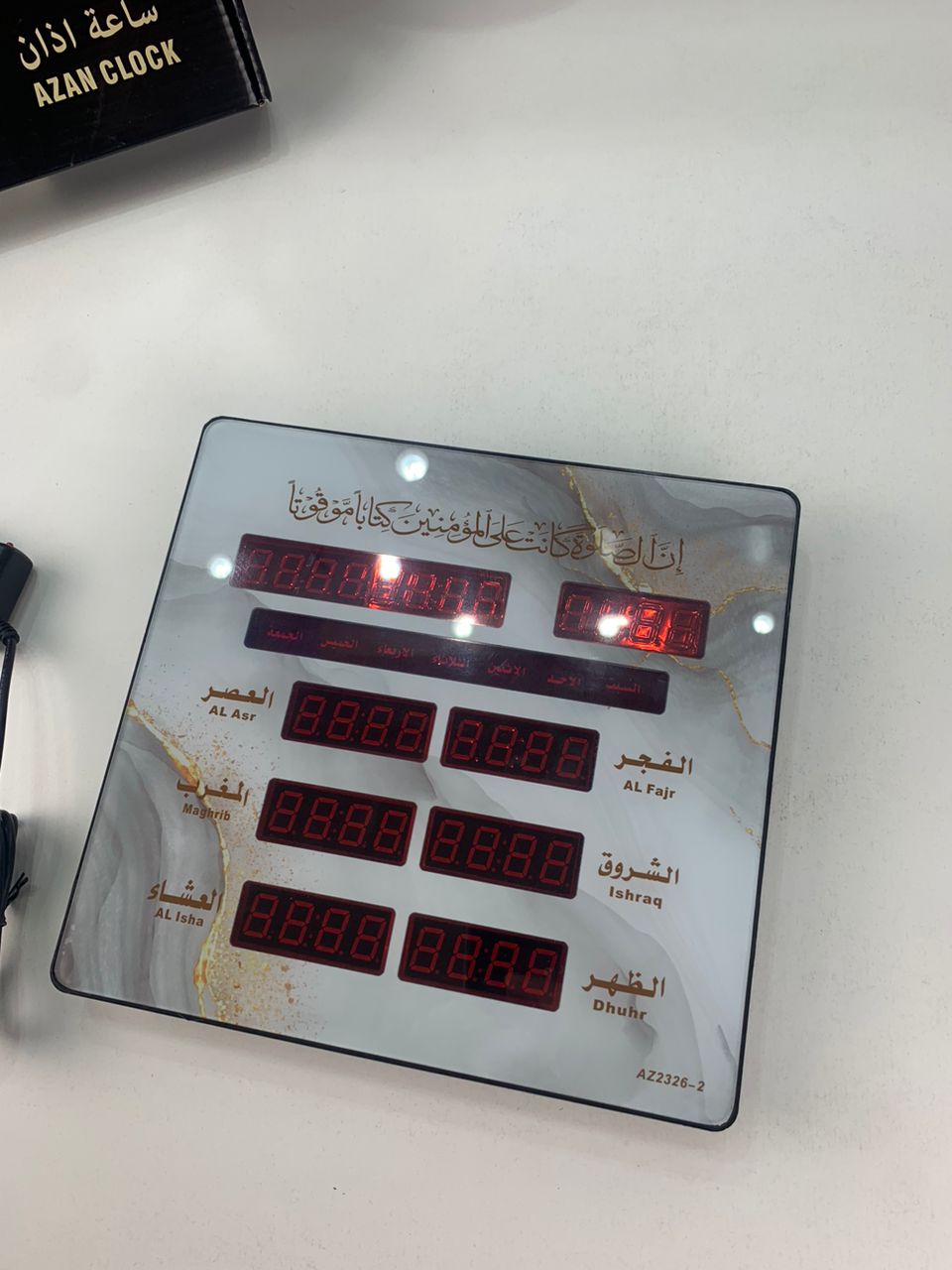 🕌 الساعة الرقمية الإسلامية AZ2326-1 ⏱️تقويم هجري أوتوماتيكي: عرض الشهر الهجري واليوم مع إمكانية التعديل اليدوي.مواقيت الصلاة: عرض دقيق للأذان الخمسة ووقت شروق الشمس.تنبيه لكل صلاة: صوتي وضوئي مع إمكانية ضبط الإقامة.وضع توفير الطاقة: إيقاف التنبيهات ليلاً مع بقاء الساعة ظاهرة.عرض درجة الحرارة: بين 0 و40 درجة مئوية.تنسيقات الوقت: 12 أو 24 ساعة لراحة أكبر.