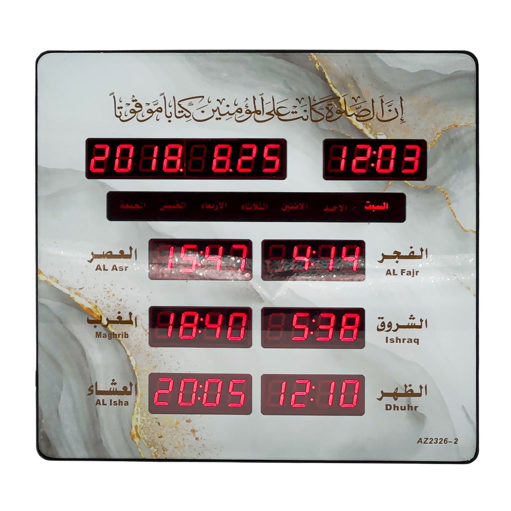 🕌 الساعة الرقمية الإسلامية AZ2326-1 ⏱️تقويم هجري أوتوماتيكي: عرض الشهر الهجري واليوم مع إمكانية التعديل اليدوي.مواقيت الصلاة: عرض دقيق للأذان الخمسة ووقت شروق الشمس.تنبيه لكل صلاة: صوتي وضوئي مع إمكانية ضبط الإقامة.وضع توفير الطاقة: إيقاف التنبيهات ليلاً مع بقاء الساعة ظاهرة.عرض درجة الحرارة: بين 0 و40 درجة مئوية.تنسيقات الوقت: 12 أو 24 ساعة لراحة أكبر.