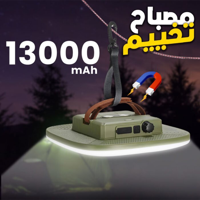 مصباح التخييم المطور 2025: يوفر إضاءة قوية تصل إلى 4000 لومن مع 4 أوضاع للإضاءة: بيضاء، دافئة، طبيعية، ووميض SOS. يمكن تعديل شدة الإضاءة بسهولة بزر واحد.إضاءة طويلة الأمد (110 ساعة): ببطارية بسعة 13000mAh تشحن خلال 4.5 ساعات، توفر حتى 110 ساعة من الإضاءة المستمرة (في الوضع الأدنى). مثالية للتخييم، الطوارئ، وانقطاع الكهرباء.تصميم محمول: بأبعاد 22×22 سم ووزن 319 غ فقط، يمكن حملها بسهولة في حقيبة الظهر. تأتي مع خطاف ومغناطيس للتثبيت في أي مكان.بطارية قابلة لإعادة الشحن + باور بانك: يمكن استخدامها لشحن الأجهزة بخرج 5V-2.4A. مزودة بأربعة مؤشرات LED توضح حالة الشحن.مقاومة للماء والمتانة: مصممة بمادة متينة مقاومة للماء بمعيار IPX5، مقاومة للرياح، المطر، والسقوط، ما يجعلها مثالية لجميع ظروف التخييم.