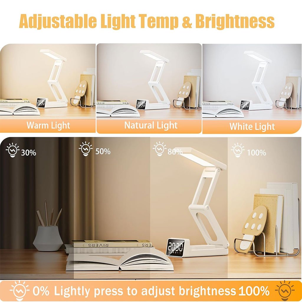 ⏰ وظيفة منبّه رقميهذه المصباح اللاسلكي يعمل أيضًا كمنبّه رقمي مع إمكانية ضبط منبّهين مختلفين، مما يجعله عمليًا ومتعدد الاستخدامات لوضعه على طاولة السرير أو المكتب. استيقظ كل صباح على ضوءه الناعم وابدأ يومك بنشاط.🔋 【مصباح ببطارية قابلة للشحن 10,000mAh】مزود ببطارية قوية قابلة للشحن بسعة 10,000mAh، يمنحك إضاءة طويلة الأمد دون الحاجة للشحن المتكرر.💡 【سطوع قابل للتعديل】يتميز بخاصية التعتيم المستمر التي تسمح لك بضبط مستوى السطوع حسب تفضيلك. سواء كنت تبحث عن إضاءة هادئة للاسترخاء أو إضاءة قوية للقراءة والعمل، يمكنك بسهولة تخصيص شدة الضوء لخلق الأجواء المناسبة.🎨 【3 أوضاع إضاءة】يوفر المصباح 3 ألوان مختلفة للإضاءة لتناسب مختلف الأوضاع:ضوء دافئ لجو مريح في غرفة النومضوء محايد للأنشطة اليوميةضوء أبيض بارد لمزيد من التركيز في المكتب وكل ذلك بضبط بسيط وسهل.📐 تصميم قابل للطي ومحمولبفضل تصميمه القابل للطي، يمكنك حمله بسهولة إلى أي مكان. مثالي للسفر، التخييم أو حتى الاستخدام داخل المنزل. حجمه المدمج وخفة وزنه يضمنان لك الراحة وسهولة الاستخدام في جميع الظروف.⚙️ الأبعاد: موضحة في الصور