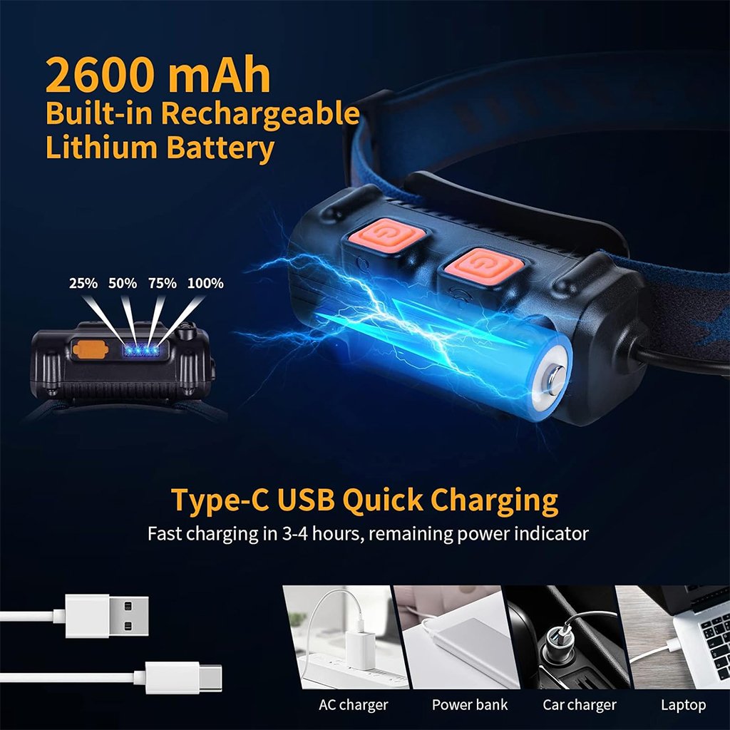 مصباح أمامي متعدد الوظائف (LED): مصباح للرأس بسطوع 600 لومن مع 6 أوضاع إضاءة (قوي/ضعيف/وميض لكل من الشريط والعدسة الأمامية).المواصفات:مستشعر حركة: يمكن تشغيله وإيقافه بتحريك اليد أمامه.زاوية إضاءة واسعة 230°: مع إمكانية ضبط العدسة الأمامية عموديًا 135° ومدى يصل إلى 350 متر.بطارية ليثيوم 2600mAh: قابلة للشحن عبر منفذ Type-C بمدة تشغيل 5-8 ساعات.مؤشر شحن: لمعرفة مستوى البطارية بسهولة.وزن خفيف (131 جم): مع حزام مطاطي قابل للتعديل ليناسب الكبار والصغار.مقاوم للماء IP65: مناسب للاستخدام الداخلي والخارجي (تخييم، صيد، تسلق، إصلاح سيارات، طوارئ).