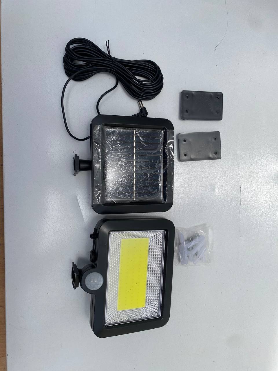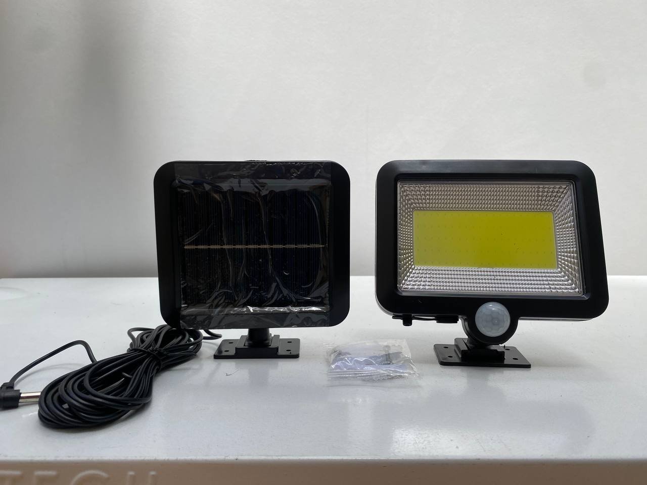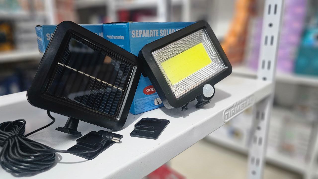 كشاف LED شمسي مع حساس حركة:المميزات:مصباح LED موفر للطاقة.تركيب بسيط وسريع.ضوء أبيض بارد – 400 لومن.مزود بحساس حركة وحساس ضوء مدمجين.مناسب للاستخدام الداخلي والخارجي.مقاوم للعوامل الجوية بدرجة حماية IP44.استهلاك طاقة: 5 واط.الوصف:يعمل بالطاقة الشمسية لتوفير إضاءة آمنة واقتصادية وصديقة للبيئة.مثالي لإضاءة الحدائق، المداخل، الممرات، السلالم، مواقف السيارات.الحساسات تضمن عمل المصباح فقط في الظلام وعند الحاجة.البطارية تُشحن بالطاقة الشمسية نهاراً وتشغل المصباح ليلاً تلقائياً.