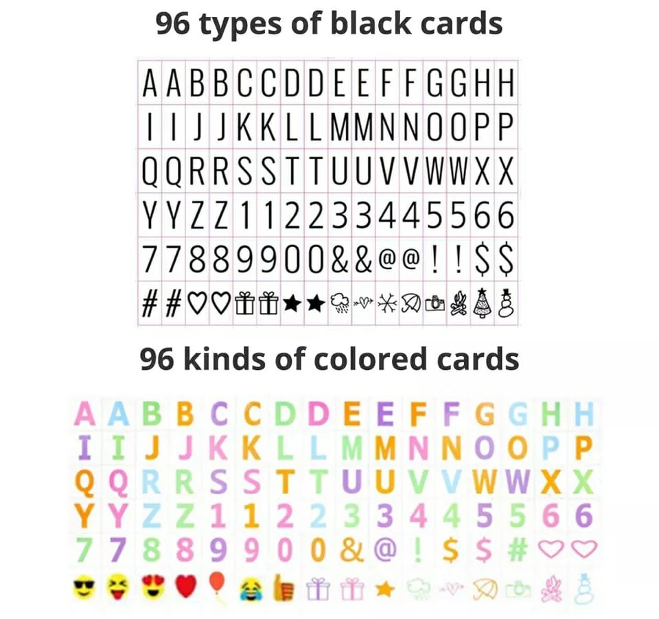 وصف المنتج – صندوق إضاءة LED مع أحرفنوع الإضاءة: مصباح ليلي / مصباح مكتبي 5Vالجهد: DC5Vالقدرة: 2 واطالبطارية: بطاريات AA (غير مشمولة)عدد الأحرف والرموز: 96 قطعة (لون أسود)المفتاح: زر تشغيل/إيقافالحجم: A5 – 21×15×5 سم | بطاقات 24×45 ممالاستخدامات: مثالي للديكور والهدايا لغرف النوم، المطاعم، المتاجر، أعياد الميلاد والمناسبات. محتويات العبوة: 1 × صندوق إضاءة LED 1 × مجموعة بطاقات (96 قطعة)