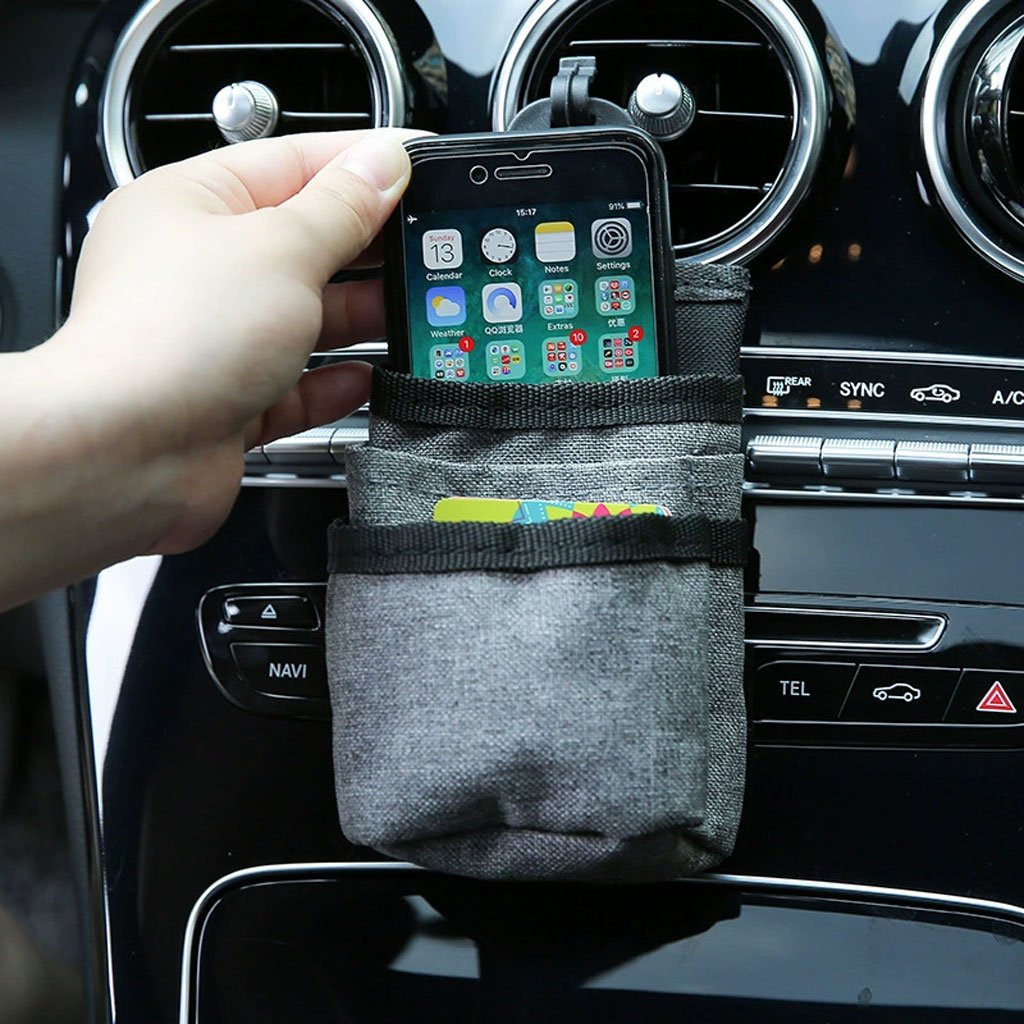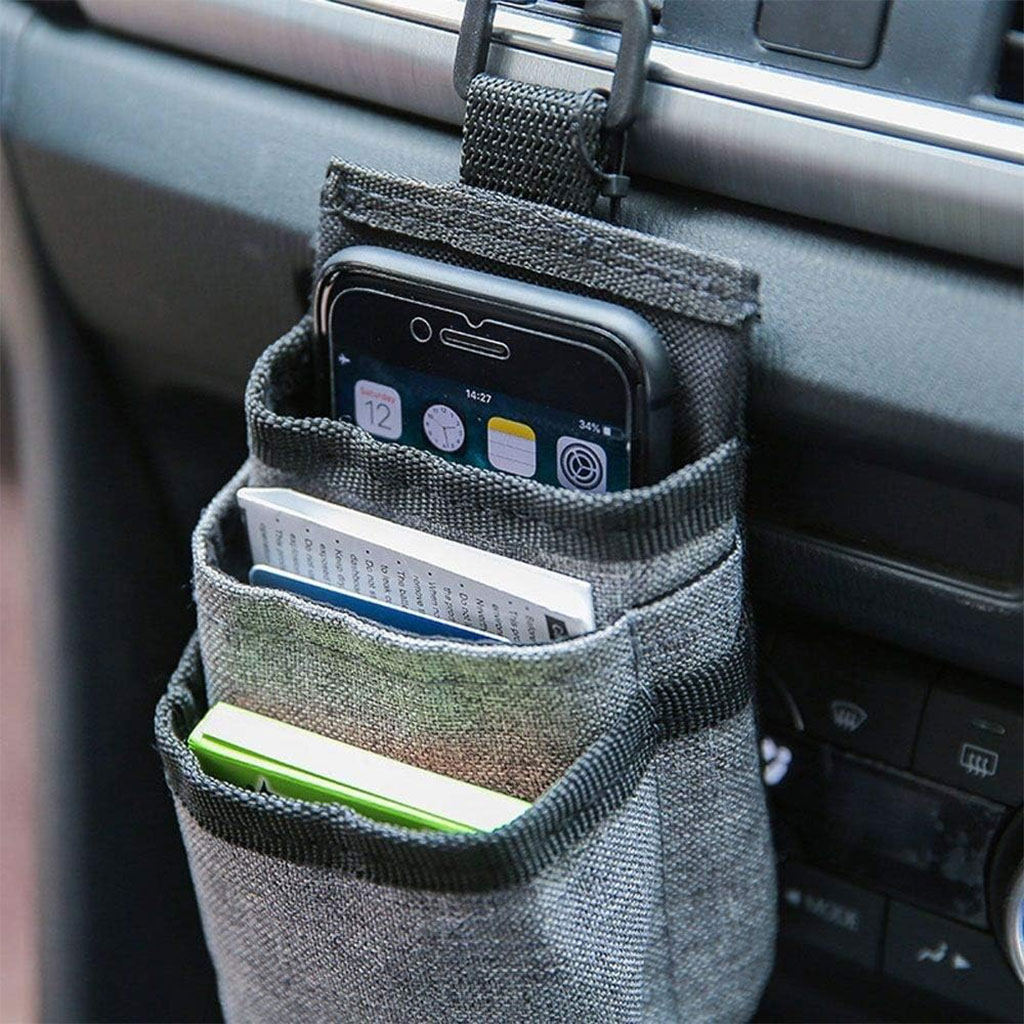 4️⃣ حقيبة تخزين متعددة الاستخدامات للمقاعد الأمامية 🚘📱المميزات : – 📲 فتحة أسفل الحقيبة للشحن أثناء حفظ الهاتف في مكان آمن. – 🎒 5 جيوب: 3 كبيرة للهاتف، الشاحن، الكايبلات، الملاحظات، النظارات + 2 صغيرة للأقلام. – 🧵 الخامة: قماش سهل التنظيف. – 🎁 المحتوى: 1 حامل + 1 مشبك – سهل التركيب والاستخدام.الخصائص:الاستخدام: للسيارات 🚗اللون: رماديالأبعاد: 5.75 x 3.5 x 0.5 بوصة///