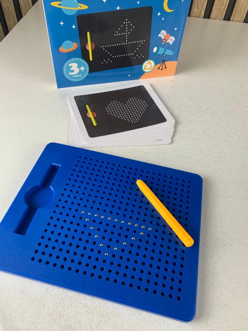 🧲 لوحة رسم مغناطيسية للأطفال – متعة بلا حدود!🎨 رسم بدون فوضىيستطيع الأطفال الرسم والابتكار على لوحة الرسم المغناطيسية باستخدام القلم المرفق دون الحاجة للورق أو الحبر. كما يمكنهم مسح الرسومات وإعادة استخدامها في أي وقت. تتوفر أيضًا بطاقات رسم مزدوجة الوجه لتساعد الطفل على تقليد الأشكال وتعلّم الرسم بسهولة.📏 مضغوطة وسهلة الحملالأبعاد: 21.5 × 17.5 × 1.2 سممناسبة تمامًا ليد الطفليمكن وضعها في الحقيبة أو المكتب مثالية للاستخدام في المنزل، المدرسة، أو حتى أثناء السفر 🚗✈️🧒 سهلة الاستخداممرّر القلم المغناطيسي على سطح اللوحة لرفع الكرات المعدنية وتشكيل الرسومات.لإعادة الكرات إلى مكانها، ادفعها بخفة بواسطة جانب القلم أو الأصبع.🔒 آمنة ومناسبة للأطفالمصنوعة من بلاستيك عالي الجودة وبكرات فولاذية آمنة.البراغي مثبتة بإحكام ومقاومة للسقوط.الكرات مثبتة داخل اللوحة ولن تسقط نهائيًا. ✔️ لعب آمن ومطمئن للآباء.🧠 تنمية وتعلم مبكرهذه اللوحة هي وسيلة رائعة لتطوير:المهارات الحركية الدقيقةالتنسيق بين العين واليدالإبداع والتخيل كما يمكن للأطفال اللعب مع والديهم لتعزيز التفاعل والتواصل الأسري 🤝
