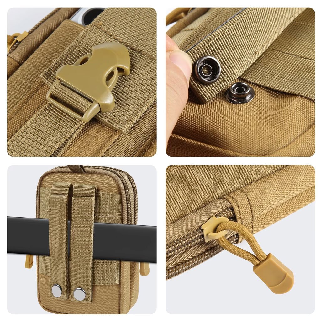 حقيبة خصر تكتيكية (EDC MOLLE)المقاسات: 18 × 12 × 6 سم، الوزن حوالي 170 غ.خامة قوية وخفيفة: مصنوعة من النايلون المقاوم للتآكل والخدش وفقدان اللون.تصميم متعدد الاستخدامات: يمكن استخدامها كحقيبة أدوات صغيرة، أو حقيبة خصر، أو حقيبة هاتف، أو حقيبة معدات صغيرة للكاميرا أو المفاتيح أو المصباح اليدوي أو البوصلة.مناسبة للأنشطة الخارجية: مثالية للسفر، التسلق، الصيد، التخييم، الصيد البري، المشي لمسافات طويلة والعمل اليومي.قابلة للتثبيت بالنظام التكتيكي MOLLE: يمكن تعليقها على الأحزمة أو السترات أو الحقائب التكتيكية الكبيرة أو الحقائب الطبية.