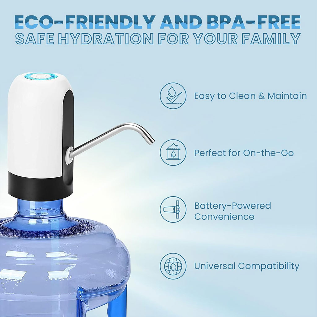【تشغيل محمول بدون ضوضاء】 اضغط فقط على زر الـLED لتحصل على الماء بسرعة، واضغط مرة أخرى لإيقاف التدفق. هذه المضخة سهلة الاستخدام حتى للأطفال وكبار السن. 【خالية من السموم والروائح】 مصنوعة من أنبوب سيليكون مخصص للطعام، وفولاذ غير قابل للصدأ 304، وبلاستيك عالي الكثافة خالٍ من الـBPA. 【توافق عالي】 مناسبة لقوارير المياه بسعات 1-2-3-4-5 جالون بدون إزالة الغطاء، مثالية للمنازل والمكاتب والرحلات والنزهات والشواطئ. 【بطارية تدوم طويلاً】 شحن كامل لمدة 3 ساعات يكفي لمدة 30-40 يومًا أو لتعبئة 5-6 قوارير ماء (5 جالون). 【سهلة التنظيف】 الأنبوب والفوهة القابلان للإزالة يسهلان تنظيفها مقارنة بالموزعات التقليدية.