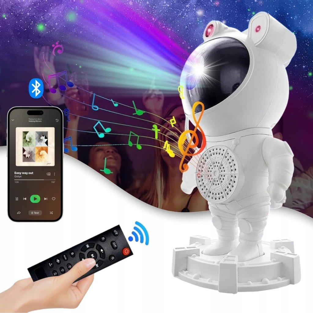 مصباح عرض نجوم على شكل رائد فضاء مع مكبر بلوتوثمكبر صوت بلوتوث مدمج لتشغيل الموسيقى مباشرة من هاتفك.إسقاط نجوم وسحب ملونة وقمر يضفي أجواء هادئة ومريحة لغرفة النوم أو السينما المنزلية.رأس رائد فضاء مغناطيسي قابل للتدوير لضبط زاوية العرض بسهولة.ريموت للتحكم الكامل: تغيير الألوان، السطوع، سرعة الحركة، وضبط المؤقت لإيقاف التشغيل تلقائيًا.إضاءة RGBW مع ليزر أخضر (10~20mW).مواد عالية الجودة: هيكل بلاستيكي هندسي – إدخال طاقة DC 5V/2A عبر كابل USB.الأبعاد: الارتفاع 190 مم × العرض 132 مم.مناسب لغرف النوم، الصالات، الحفلات، والألعاب ويصلح كهدية مثالية للكبار والأطفال.المحتويات: مصباح عرض ×1، كابل طاقة ×1، ريموت ×1، دليل المستخدم ×1.