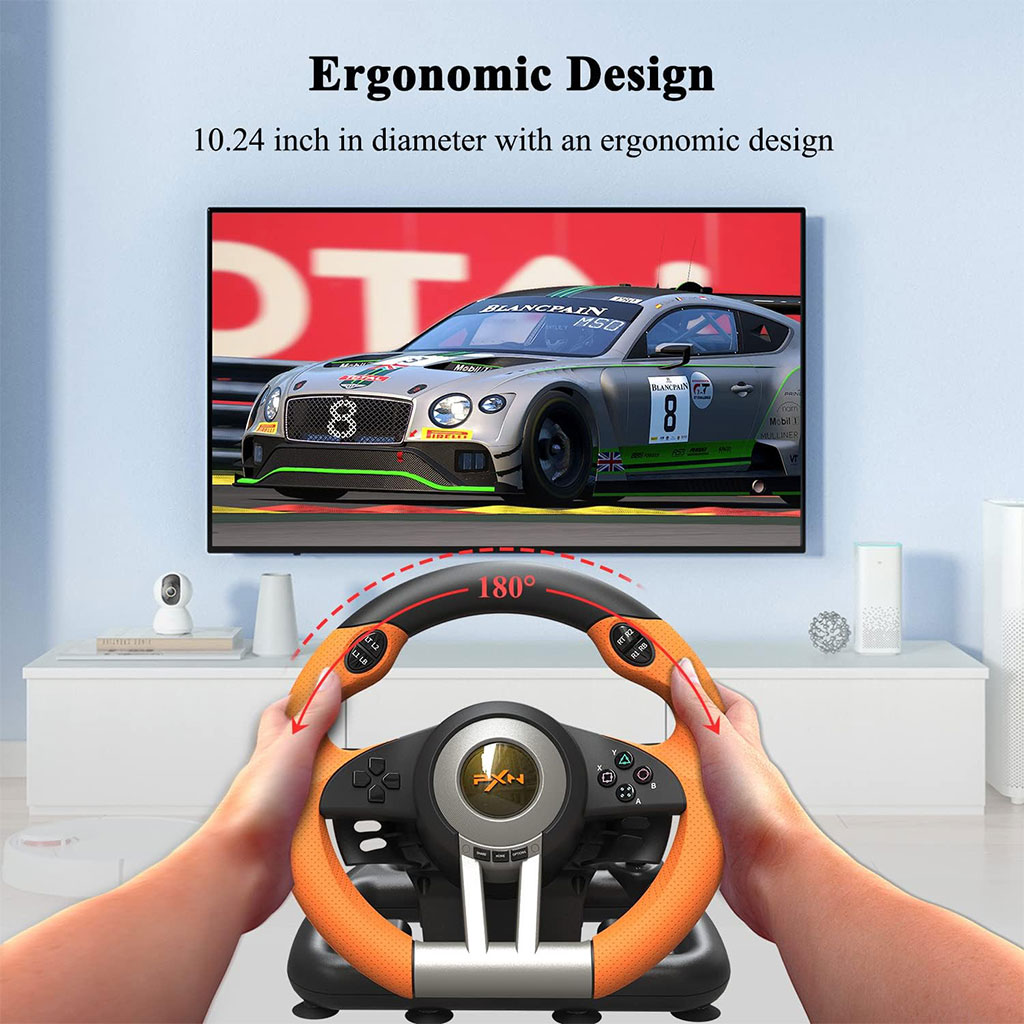 🏎️ عجلة قيادة الألعاب PXN V3 – متوافقة مع 6 منصاتتوافق شامل: تعمل على PC، PS3، PS4، Xbox One، Xbox Series X/S، Switch، وأنظمة Windows 7/8/10/11.متعة بلا حدود: مثالية لألعاب مثل Forza Horizon، Need for Speed، F1، Mario Kart، وغيرها.تحكم واقعي: دواسات مريحة وسريعة الاستجابة، تصميم مانع للانزلاق، مع إمكانية التبديل بين وضعي X و D.تصميم قوي: مصنوعة من ABS عالي الجودة مع مشابك قوية لتثبيت مثالي على المكتب.