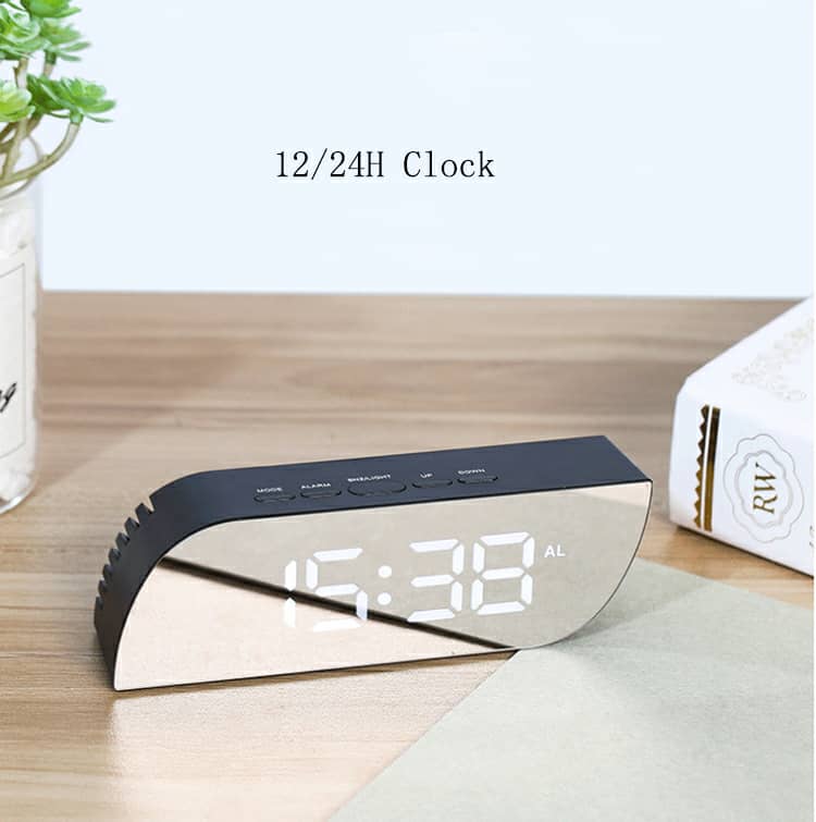 منبه رقمي مع مرآةالمواصفات:يعمل كمنبه ومرآة ومقياس حرارة.شاشة LED تتغير شدتها حسب الإضاءة (سرعتان للسطوع).عرض الوقت بنظام 12/24 ساعة.مدى استشعار الحرارة: -10 إلى 50 درجة مئوية.مادة الصنع: ABS.الطاقة: 3 بطاريات AAA (غير مرفقة) أو عبر منفذ USB.الحجم: 15.2 × 4.5 × 3.4 سم. محتويات العبوة:1 × منبه.1 × كابل شحن. .