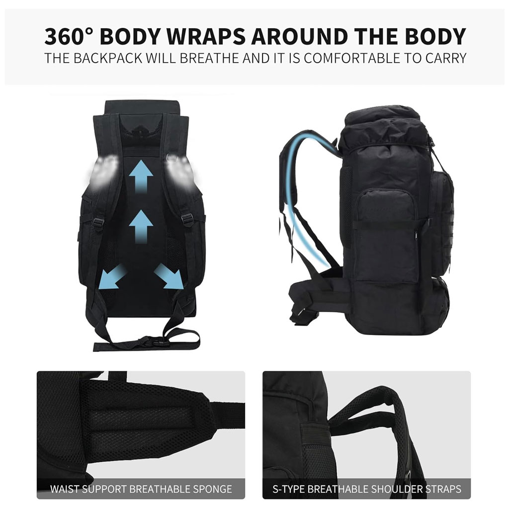 حقائب ظهر للمغامرات والرحلات:المواد:مصنوعة من النايلون المقاوم للماء أو قماش أوكسفورد 900D عالي الجودة.مقاومة للخدوش والتمزق، متينة ومناسبة للاستخدام الطويل في البيئات الرطبة.السعات المتوفرة:80 لتر: تصميم مريح مع حمالات كتف مبطنة وظهر داعم لتخفيف الضغط، مناسب للرجال والنساء للأنشطة الخارجية مثل ركوب الدراجات، التسلق، المشي، الصيد والرحلات.الراحة والتصميم:حزام صدر وحزام خصر لتوزيع الوزن.أحزمة كتف مبطنة بتصميم S لتقليل الضغط على الأكتاف.ظهر مبطن بسماكة عالية مع قدرة تهوية ممتازة.أحزمة وأجزاء قابلة للتعديل لضمان راحة كاملة.المساحات والوظائف:جيب رئيسي كبير جدًا لحمل الأغراض الأساسية.عدة جيوب أمامية وسحابات بأحجام مختلفة لحمل الهاتف، البطاقة، المفاتيح.جيوب جانبية للمظلات وقوارير المياه.نظام تعليق قوي ومتين لتحمل المعدات الكبيرة.المتانة:أبازيم من مادة PPR عالية المقاومة للظروف الجوية والحمولات الثقيلة.مقاومة للماء مع بطانة من النايلون لمنع تسرب السوائل.