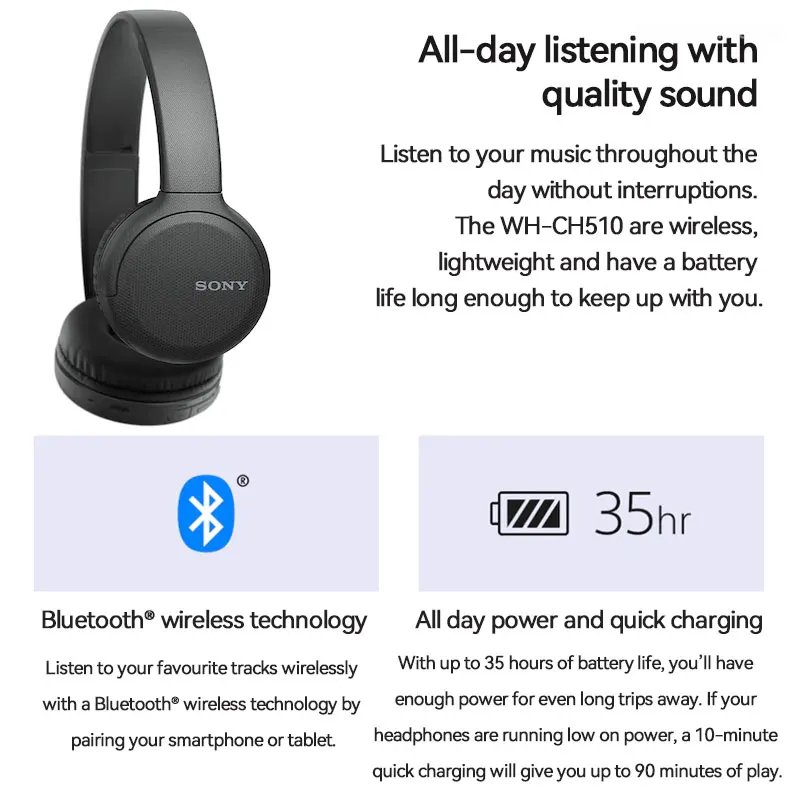 Sony Casque Bluetooth Original sans fil assistant vocal intégré, charge rapide, autonomie jusqu'à 35 heures WH-CH510
