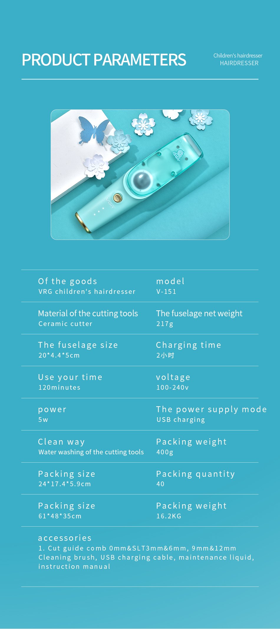 آلة قص شعر الأطفال VGR V-151حجم صغير: مناسب لقص شعر الطفل بسهولة.وضع صامت: لا يسبب ضوضاء مزعجة.شحن USB: اقتصادي وسهل الاستخدام.خفيفة الوزن وسهلة الحمل والاستخدام.المواصفات:الطول: 20×4.4×5 سماللون: أزرقرأس أداة من السيراميكطاقة: 5 واطجهد: 100-240 فولتوقت الشحن: ساعتانوقت الاستخدام: 120 دقيقةمحتويات العبوة:ماكينة حلاقة للأطفال3 أمشاط (0 مم، 3 مم، 6 مم، 9 مم، 12 مم)فرشاة تنظيفكابل USB للشحنزيتدليل المستخدم
