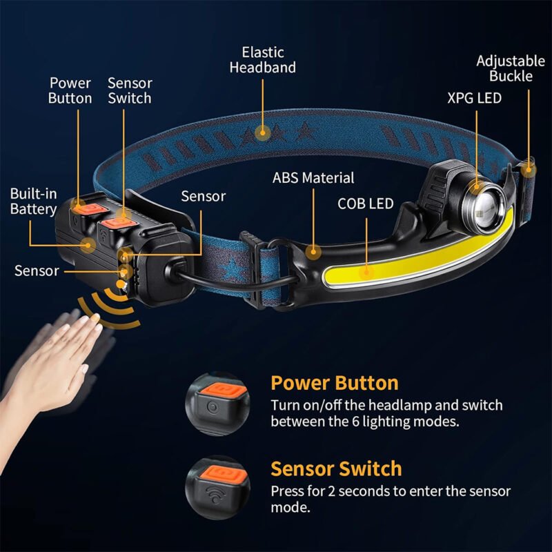 Lampe Frontale Rechargeable 2600mAh avec Capteur Mouvement